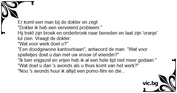 Komt 'n man bij de dokter, en zegt: "Dokter, ik heb een probleem." Zegt de dokter: "Wat is er dan?" Zegt de man: "Nou, het zit zo... Ik heb een oranje lul". Dokter: "Oh wat vreemd, en u weet zelf...
