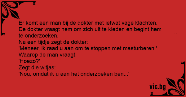 Er komt een man bij de dokter met ietwat vage klachten. De dokter vraagt hem om zich uit te kleden en begint hem te onderzoeken. Na een tijdje zegt de dokter: 'Meneer, ik raad u aan om te stoppen met masturberen.' Waarop de man vraagt: 'Hoezo?' Zegt die witjas: 'Nou, omdat ik u aan het onderzoeken ben...'