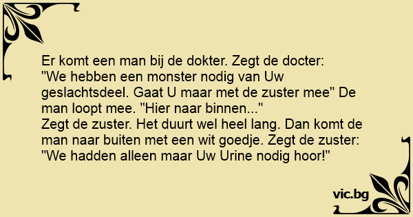 "We hebben een monster nodig van Uw geslachtsdeel. Gaat U maar met de zuster mee" De man loopt mee. "Hier naar binnen..."