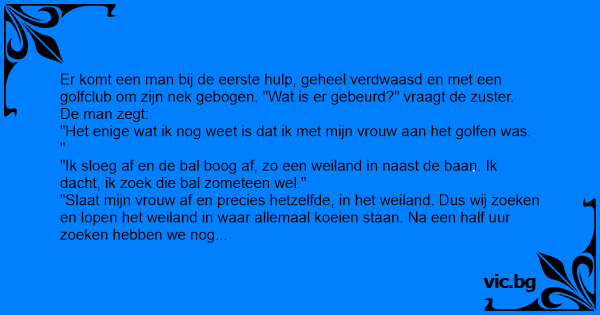 Er komt een man bij de eerste hulp, geheel verdwaasd en met een golfclub om zijn nek gebogen. "Wat is er gebeurd?" vraagt de zuster.