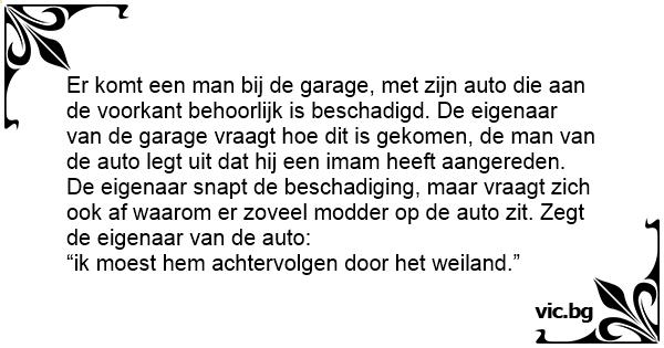 Er komt een man bij de garage, met zijn auto die aan de voorkant behoorlijk is beschadigd. De eigenaar van de garage vraagt hое dit is gekomen, de man van de auto legt uit dat hij een imam heeft aangereden. De eigenaar snapt de beschadiging, maar vraagt zich ook af waarom er zoveel modder op de auto zit. Zegt de eigenaar van de auto: