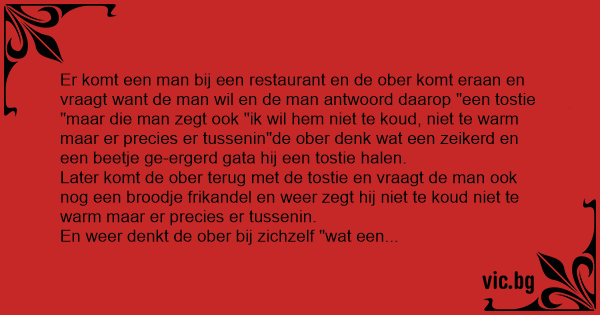 Er komt een man bij een restaurant en de ober komt eraan en vraagt want de man wil en de man antwoord daarop "een tostie "maar die man zegt ook "ik wil hem niet te koud, niet te warm maar er precies er tussenin"de ober denk wat een zeikerd en een beetje ge-ergerd gata hij een tostie halen.