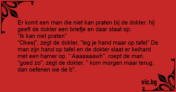 "Okeej", zegt de dokter, "leg je hand maar op tafel" De man zijn hand op tafel en de dokter slaat er keihard met een hamer op. " Aaaaaaawh", roept de man. "goed zo", zegt de dokter, " kom morgen maar terug, dan oefenen we de b".