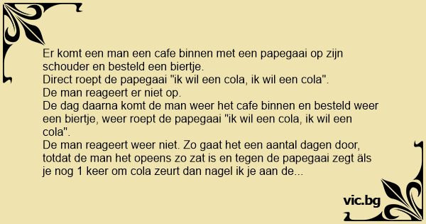 De dag daarna komt de man weer het cafe binnen en besteld weer een biertje, weer roept de papegaai "ik wil een cola, ik wil een cola".