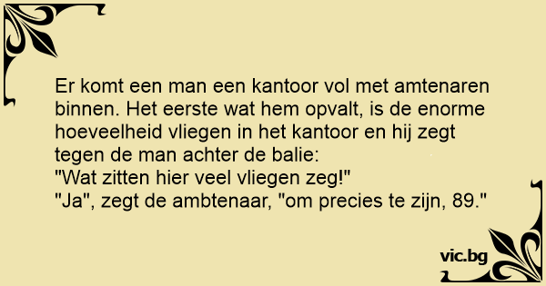 Er komt een man een kantoor vol met amtenaren binnen. Het eerste wat hem opvalt, is de enorme hoeveelheid vliegen in het kantoor en hij zegt tegen de man achter de balie: