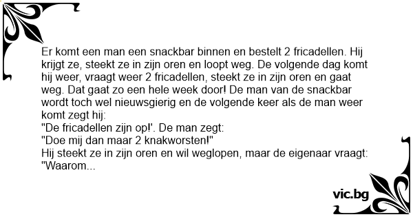 Er komt een man een snackbar binnen en bestelt 2 fricadellen. Hij krijgt ze, steekt ze in zijn oren en loopt weg. De volgende dag komt hij weer, vraagt weer 2 fricadellen, steekt ze in zijn oren en gaat weg. Dat gaat zo een hele week door! De man van de snackbar wordt toch wel nieuwsgierig en de volgende keer als de man weer komt zegt hij: