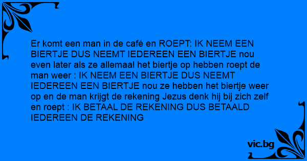 Er komt een man in de café en ROEPT: IK NEEM EEN BIERTJE DUS NEEMT IEDEREEN EEN BIERTJE nou even later als ze allemaal het biertje op hebben roept de man weer : IK NEEM EEN BIERTJE DUS NEEMT IEDEREEN EEN BIERTJE nou ze hebben het biertje weer op en de man krijgt de rekening Jezus denk hij bij zich zelf en roept : IK BETAAL DE REKENING DUS BETAALD IEDEREEN DE REKENING