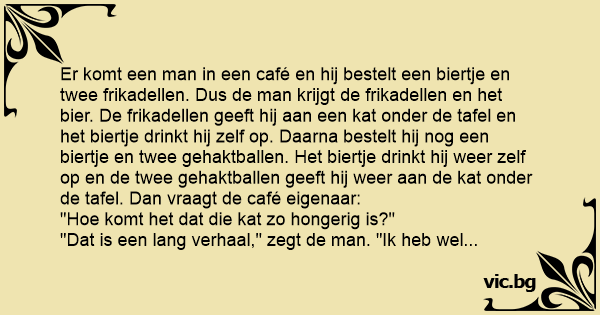 Er komt een man in een café en hij bestelt een biertje en twee frikadellen. Dus de man krijgt de frikadellen en het bier. De frikadellen geeft hij aan een kat onder de tafel en het biertje drinkt hij zelf op. Daarna bestelt hij nog een biertje en twee gehaktballen. Het biertje drinkt hij weer zelf op en de twee gehaktballen geeft hij weer aan de kat onder de tafel. Dan vraagt de café eigenaar:
