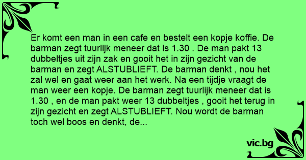 Er komt een man in een cafe en bestelt een kopje koffie. De barman zegt tuurlijk meneer dat is 1.30 . De man pakt 13 dubbeltjes uit zijn zак en gooit het in zijn gezicht van de barman en zegt ALSTUBLIEFT. De barman denkt , nou het zal wel en gaat weer aan het werk. Na een tijdje vraagt de man weer een kopje. De barman zegt tuurlijk meneer dat is 1.30 , en de man pakt weer 13 dubbeltjes , gooit het terug in zijn gezicht en zegt ALSTUBLIEFT. Nou wordt de barman toch wel boos en denkt, de volgende keer pak ik hem terug. Nou, na een tijdje bestelt de man weer een kopje koffie en geeft 2.50. De barman pakt 12 dubbeltjes en gooit het zo bij de man in z,n gezicht, waarop de man een dubbeltje op de bar legt en zegt ; Doet u er nog maar een kopje bij.