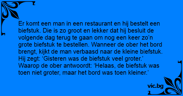 Er komt een man in een restaurant en hij bestelt een biefstuk. Die is zo groot en lekker dat hij besluit de volgende dag terug te gaan om nog een keer zo’n grote biefstuk te bestellen. Wanneer de ober het bord brengt, kijkt de man verbaasd naar de kleine biefstuk. Hij zegt: ‘Gisteren was de biefstuk veel groter.’ Waarop de ober antwoordt: ‘Helaas, de biefstuk was toen niet groter, maar het bord was toen kleiner.’