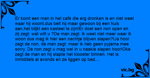 Er komt een man in het café die erg dronken is en niet weet waar hij woont,dus belt hij maar gewoon bij een huis aan,het blijkt een kasteel te zijn!Er doet een non open en zij zegt: wat wilt u ?De man zegt: ik weet niet meer waar ik woon dus mag ik hier een nachtje blijven slapen?!Ja hооr zegt de non, de man zegt: maar ik heb geen pyjama mee sorry. De non zegt u mag wel in u naakie slapen hооr!Oke zegt de man en hij stapte het klooster binnen. Het is inmiddels al avonds en ze liggen op bed. De man moest naar de wc. Omdat hij naakt is kijkt de man goed in het rond om te zien of er geen non in de gang staat...