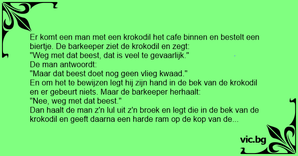 Er komt een brede man met een grote krokodil de kroeg in lopen. Iedereen kijkt verbaast naar de krokodil en deinzen allemaal een stukje achteruit. De man zegt: “Er is geen reden om bang te zijn,...