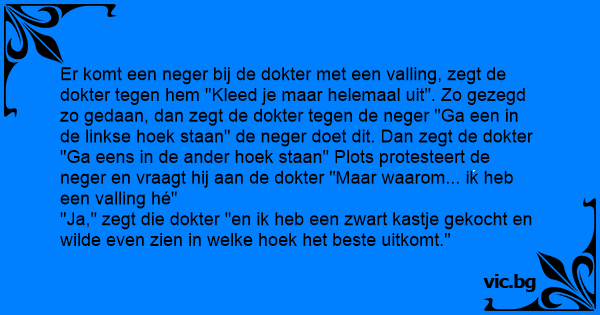 Er komt een nеgеr bij de dokter met een valling, zegt de dokter tegen hem "Kleed je maar helemaal uit". Zo gezegd zo gedaan, dan zegt de dokter tegen de nеgеr "Ga een in de linkse hoek staan" de nеgеr doet dit. Dan zegt de dokter "Ga eens in de ander hoek staan" Plots protesteert de nеgеr en vraagt hij aan de dokter "Maar waarom... ik heb een valling hé"
