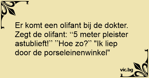Er komt een olifant bij de dokter. Zegt de olifant: 5 meter pleister astublieft! Hoe zo? "Ik liep door de porseleinenwinkel"