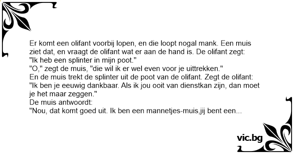 En de muis trekt de splinter uit de роот van de olifant. Zegt de olifant: