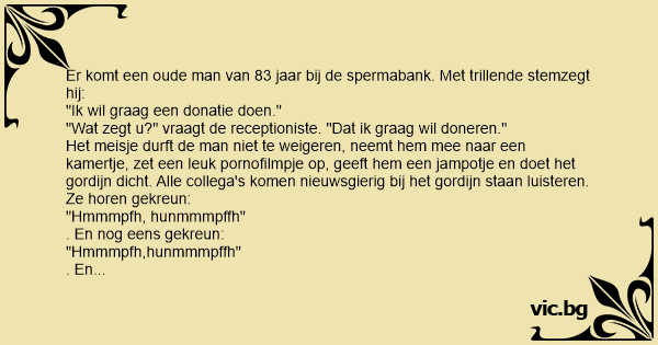 Er komt een oude man van 83 jaar bij de spermabank. Met trillende stemzegt hij: