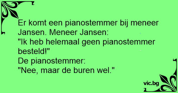 En mand banker på døren til en lejlighed: "Jeg kommer for at stemme Deres klaver." "Jamen, jeg har da ikke bedt Dem om at komme!" "Nej, men det har Deres naboer!"