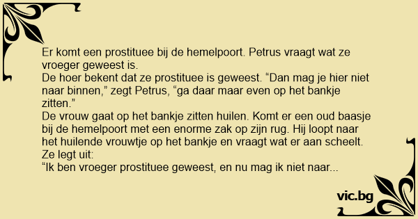 Er komt een prostituee bij de hemelpoort. Petrus vraagt wat ze vroeger geweest is.