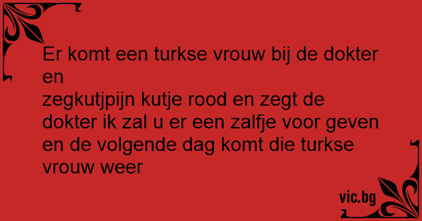 Er komt een turkse vrouw bij de dokter en zegkutjpijn kutje rood en zegt de dokter ik zal u er een zalfje voor geven en de volgende dag komt die turkse vrouw weer