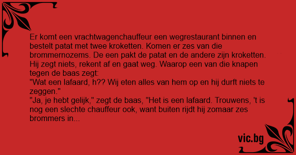 Er komt een vrachtwagenchauffeur een wegrestaurant binnen en bestelt patat met twee kroketten. Komen er zes van die brommernozems. De een pakt de patat en de andere zijn kroketten. Hij zegt niets, rekent af en gaat weg. Waarop een van die knapen tegen de baas zegt: