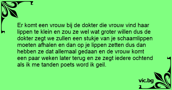 Er komt een vrouw bij de dokter die vrouw vind haar lippen te klein en zou ze wel wat groter willen dus de dokter zegt we zullen een stukje van je schaamlippen moeten afhalen en dan op je lippen zetten dus dan hebben ze dat allemaal gedaan en de vrouw komt een paar weken later terug en ze zegt iedere ochtend als ik me tanden poets word ik geil.