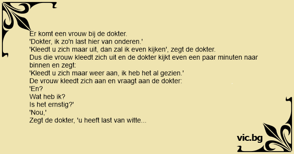 Er komt een vrouw bij de dokter. 'Dokter, ik zo'n last hier van onderen.' 'Kleedt u zich maar uit, dan zal ik even kijken', zegt de dokter. Dus die vrouw kleedt zich uit en de dokter kijkt even een paar minuten naar binnen en zegt: 'Kleedt u zich maar weer aan, ik heb het al gezien.' De vrouw kleedt zich aan en vraagt aan de dokter: 'En? Wat heb ik? Is het ernstig?' 'Nou,' Zegt de dokter, 'u heeft last van witte vloed. Het is chronisch en ik moet het opereren.' Wat zegt u?', vraagt de vrouw geschrokken. Dus de dokter antwoordt: 'U heeft last van witte vloed. Het is chronisch en ik moet het opereren.' De vrouw gaat naar huis en daar aangekomen vraagt haar man: 'En, wat zei de dokter?' 'Nou,' Zegt de vrouw, 'ik begin een beetje doof te worden en kon het vrij moeilijk verstaan, maar volgens mij zei hij: U heeft een witte роеs, dat is komisch en dat wil ik fotograferen!'
