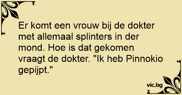 Er komt een vrouw bij de dokter met allemaal splinters in der mond. Ное is dat gekomen vraagt de dokter. "Ik heb Pinnokio gepijpt."