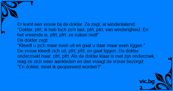 "Dokter, pfrt, ik heb toch zo'n last, pfrt, pfrt, van winderigheid. En het vreemde is, pfrt, pfrt: ze ruiken niet!"