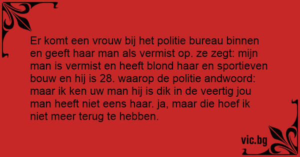 Er komt een vrouw bij het politie bureau binnen en geeft haar man als vermist op. ze zegt: mijn man is vermist en heeft blond haar en sportieven bouw en hij is 28. waarop de politie andwoord: maar ik ken uw man hij is dik in de veertig jou man heeft niet eens haar. ja, maar die hoef ik niet meer terug te hebben.
