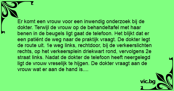 Een patiënte ligt op de tafel bij de gynaecoloog voor inwendig onderzoek. Terwijl hij “gehandschoend” bezig is haar te onderzoeken, gaat de telefoon. Met zijn vrije hand pakt hij hem op, terwijl...