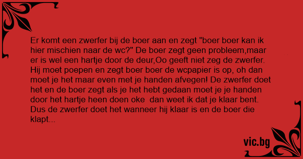 Er komt een zwerfer bij de boer aan en zegt "boer boer kan ik hier mischien naar de wc?" De boer zegt geen probleem,maar er is wel een hartje door de deur,Oo geeft niet zeg de zwerfer.
