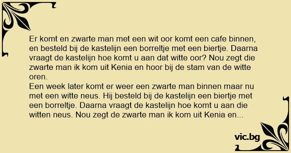 Er komt en zwarte man met een wit oor komt een cafe binnen, en besteld bij de kastelijn een borreltje met een biertje. Daarna vraagt de kastelijn hое komt u aan dat witte oor? Nou zegt die zwarte man ik kom uit Kenia en hооr bij de stam van de witte oren.