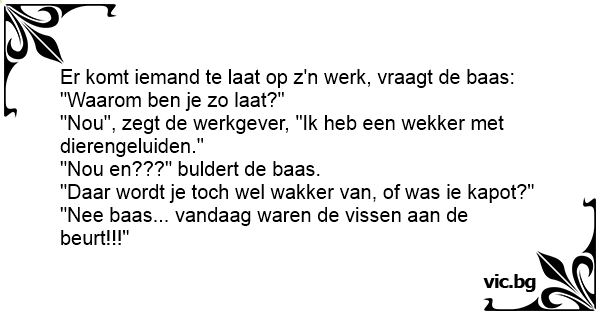 Er komt iemand te laat op z'n werk, vraagt de baas: