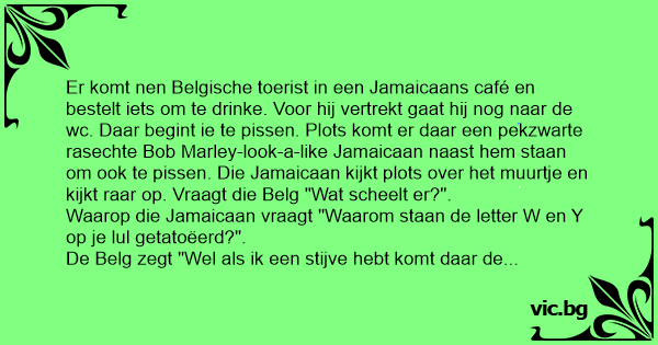 De Jamaicaan pist verder en plots kijkt de Belg ook over het muurtje en tot zijn grote verbazing ziet hij ook W en Y op zijn lul staan, waarop de Belg de zelfde vraag stelt.