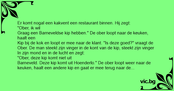 Barneveld. Deze kip komt uit Hoenderlo." De ober loopt weer naar de keuken, haalt een andere kip en gaat er mee terug naar de klant. "En deze meneer, is deze goed?" De klant steekt weer zijn vinger in de kont van de kip, steekt zijn vinger in zijn mond en in de lucht en zegt: