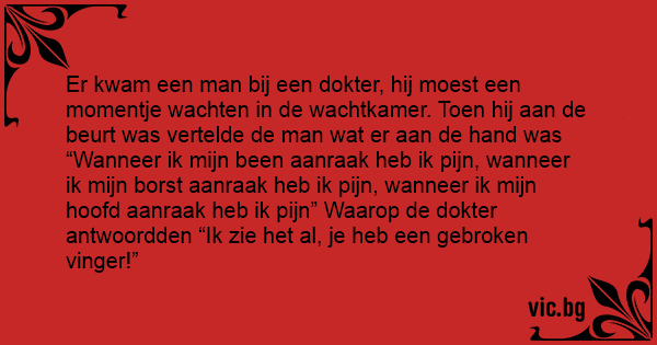 Er kwam een man bij een dokter, hij moest een momentje wachten in de wachtkamer. Toen hij aan de beurt was vertelde de man wat er aan de hand was “Wanneer ik mijn been aanraak heb ik pijn, wanneer ik mijn borst aanraak heb ik pijn, wanneer ik mijn hoofd aanraak heb ik pijn” Waarop de dokter antwoordden “Ik zie het al, je heb een gebroken vinger!”