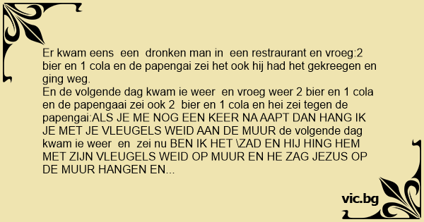 En de volgende dag kwam ie weer en vroeg weer 2 bier en 1 cola en de papengaai zei ook 2 bier en 1 cola en hei zei tegen de papengai:ALS JE ME NOG EEN KEER NA AAPT DAN HANG IK JE MET JE VLEUGELS WEID AAN DE MUUR de volgende dag kwam ie weer en zei nu BEN IK HET \ZAD EN HIJ HING HEM MET ZIJN VLEUGELS WEID OP MUUR EN HE ZAG JEZUS OP DE MUUR HANGEN EN HEI ZEI :JIJ HEBT ZEKER OOK 2 bier en 1 cola