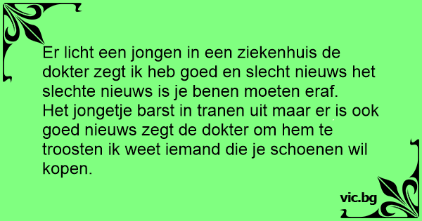 Lægen kommer ind til patienten: "Jeg har en god og en dårlig nyhed." "Giv mig den dårlige først!", siger patienten. "Vi kom til at fjerne det forkerte ben." "Hvad er den gode nyhed så?", siger...