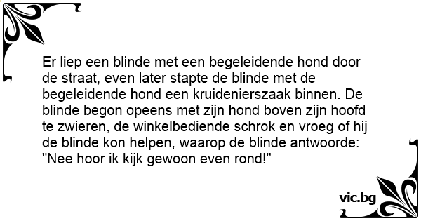 Er liep een blinde met een begeleidende hond door de straat, even later stapte de blinde met de begeleidende hond een kruidenierszaak binnen. De blinde begon opeens met zijn hond boven zijn hoofd te zwieren, de winkelbediende schrok en vroeg of hij de blinde kon helpen, waarop de blinde antwoorde: