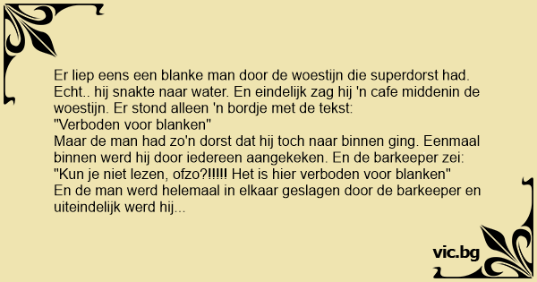 Er liep eens een blanke man door de woestijn die superdorst had. Echt.. hij snakte naar water. En eindelijk zag hij 'n cafe middenin de woestijn. Er stond alleen 'n bordje met de tekst: