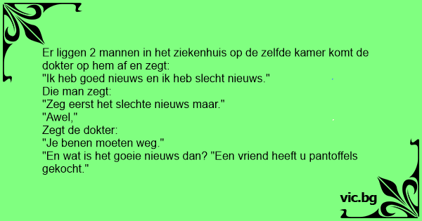 Er liggen 2 mannen in het ziekenhuis op de zelfde kamer komt de dokter op hem af en zegt: