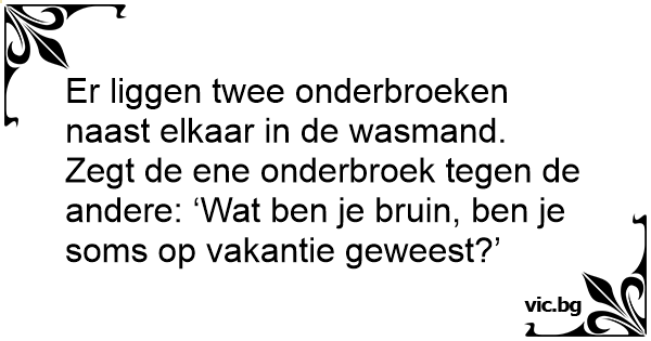 Er liggen twee onderbroeken naast elkaar in de wasmand. Zegt de ene onderbroek tegen de andere: ‘Wat ben je bruin, ben je soms op vakantie geweest?’