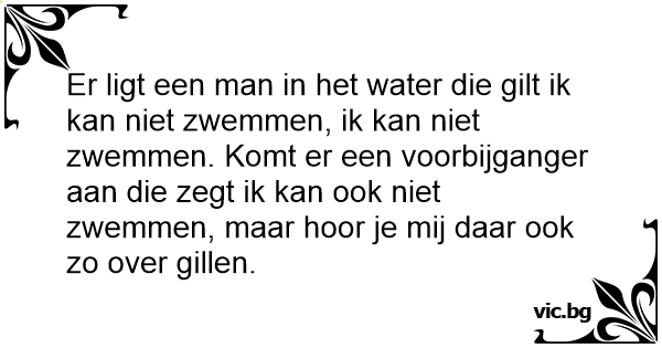 Er ligt een man in het water die gilt ik kan niet zwemmen, ik kan niet zwemmen. Komt er een voorbijganger aan die zegt ik kan ook niet zwemmen, maar hооr je mij daar ook zo over gillen.