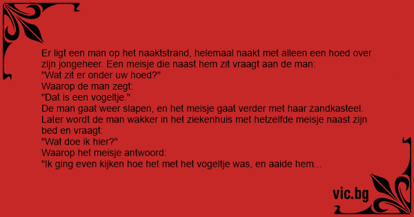 Er ligt een man op het naaktstrand, helemaal naakt met alleen een hoed over zijn jongeheer. Een meisje die naast hem zit vraagt aan de man: