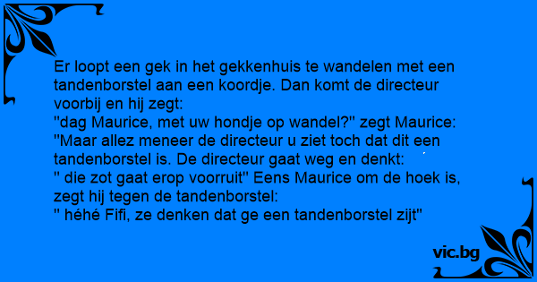 Er loopt een gek in het gekkenhuis te wandelen met een tandenborstel aan een koordje. Dan komt de directeur voorbij en hij zegt: