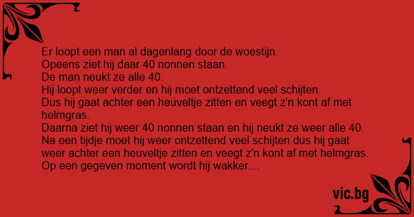 Er loopt een man al dagenlang door de woestijn. Opeens ziet hij daar 40 nonnen staan. De man neukt ze alle 40. Hij loopt weer verder en hij moet ontzettend veel schijten. Dus hij gaat achter een heuveltje zitten en veegt z'n kont af met helmgras. Daarna ziet hij weer 40 nonnen staan en hij neukt ze weer alle 40. Na een tijdje moet hij weer ontzettend veel schijten dus hij gaat weer achter een heuveltje zitten en veegt z'n kont af met helmgras. Op een gegeven moment wordt hij wakker. Z'n vrouw zegt tegen hem: 'Ik vind het niet erg dat je me 80 x op een nacht neukt, maar om dan vervolgens 2 x op m'n buik te zitten schijten en je kont af te vegen met m'n schaamhaar, dat vind ik toch te ver gaan!'