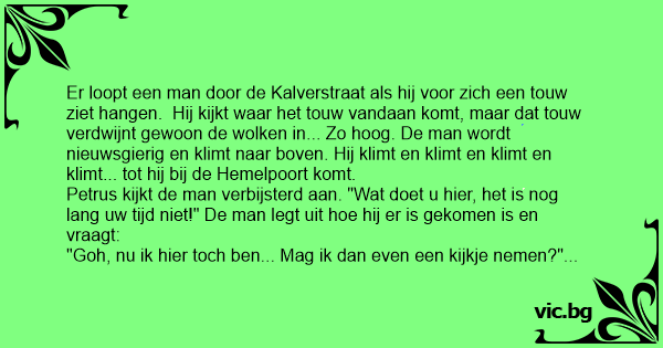 Er loopt een man door de Kalverstraat als hij voor zich een touw ziet hangen. Hij kijkt waar het touw vandaan komt, maar dat touw verdwijnt gewoon de wolken in... Zo hoog. De man wordt nieuwsgierig en klimt naar boven. Hij klimt en klimt en klimt en klimt... tot hij bij de Hemelpoort komt.