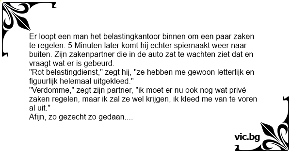 Er loopt een man het belastingkantoor binnen om een paar zaken te regelen. 5 Minuten later komt hij echter spiernaakt weer naar buiten. Zijn zakenpartner die in de auto zat te wachten ziet dat en vraagt wat er is gebeurd.