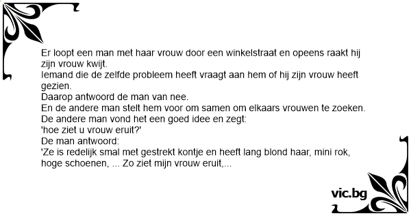 'Ze is redelijk smal met gestrekt kontje en heeft lang blond haar, mini rok, hoge schoenen, ... Zo ziet mijn vrouw eruit, en u vrouw? en u vrouw, hое ziet zij eruit?'