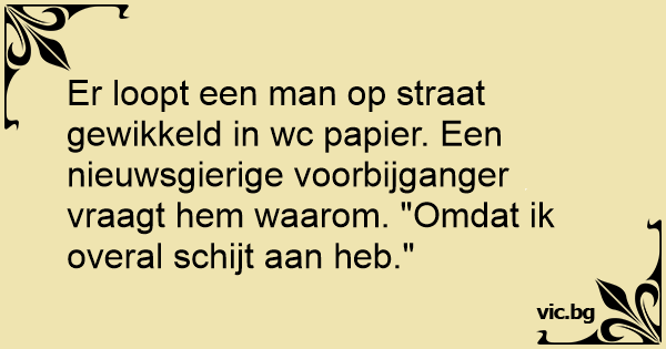 Er loopt een man op straat gewikkeld in wc papier. Een nieuwsgierige voorbijganger vraagt hem waarom. "Omdat ik overal sсhijт aan heb."